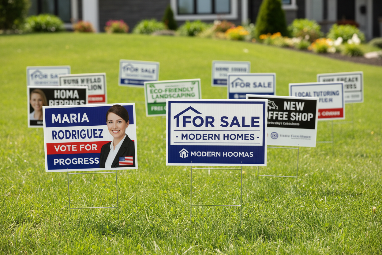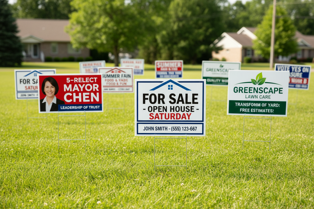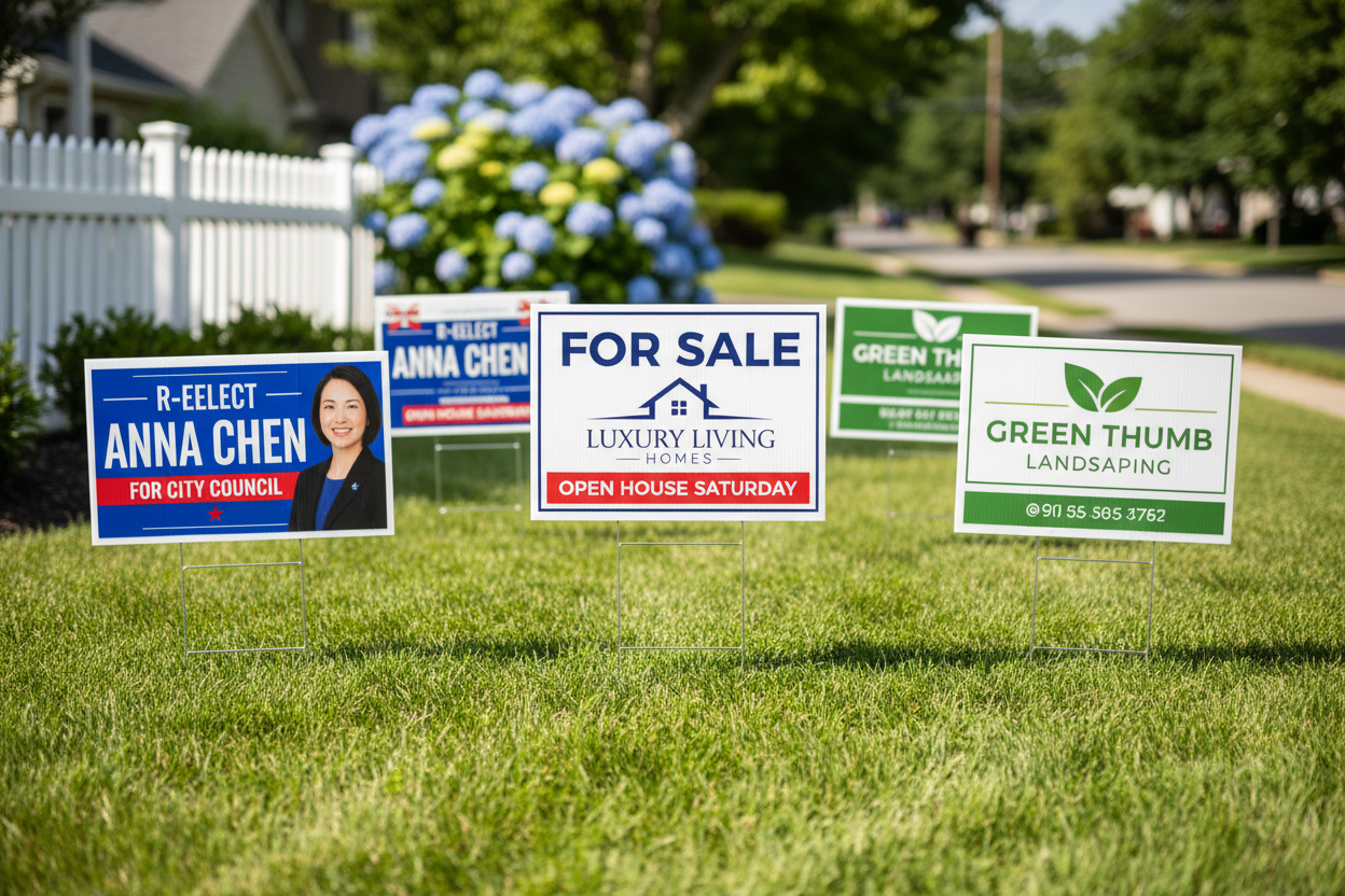 Our custom lawn signs are designed for outdoor visibility and durability. Perfect for real estate, events, political campaigns, and business promotions, these signs deliver bold messaging with weather-resistant materials built to perform outdoors.